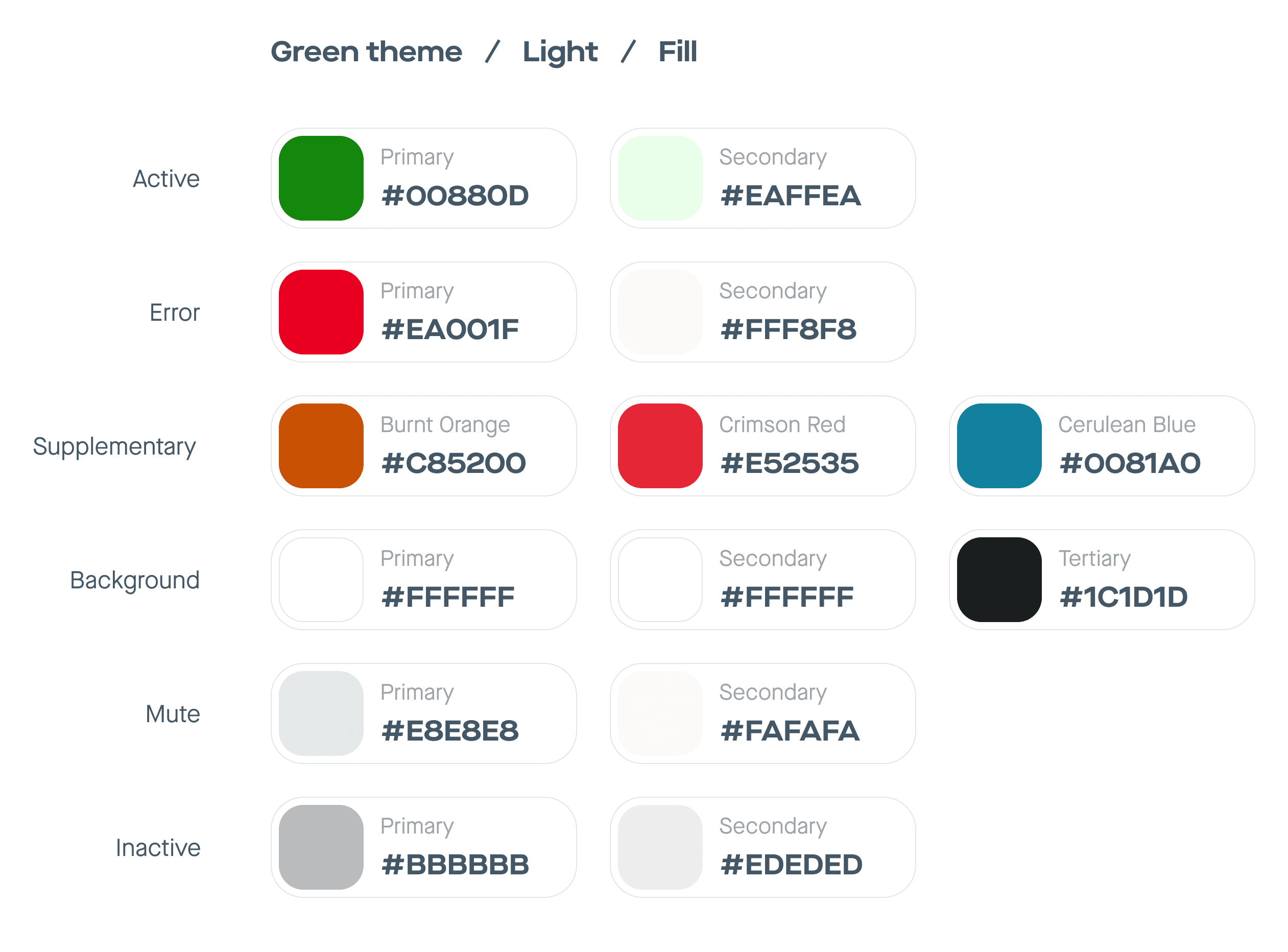 Aloha’s color system draws from Gojek’s product categories, featuring three main themes Green, Pink, and Purple. This structure allows us to maintain consistency while remaining flexible enough to develop new themes for future apps.