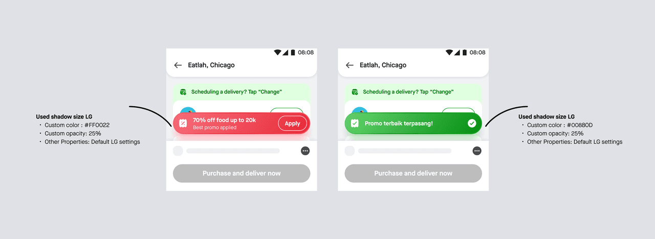 Each shadow token corresponds to a specific elevation level from low, subtle layers like cards and input fields to higher, more prominent surfaces such as modals or floating buttons. By standardizing these tokens, we maintain a coherent visual hierarchy while keeping the interface clean, legible, and true to Gojek’s visual language.