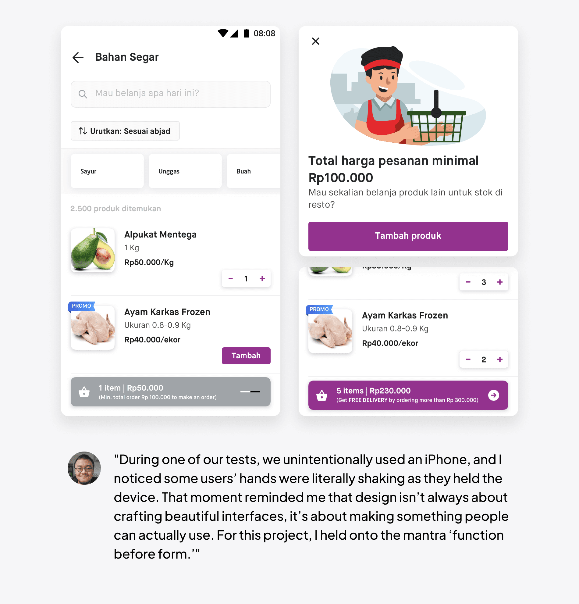 I was hired to design and build a mobile app that transformed the existing manual purchasing flow into a self-service experience for partners. By enabling partners to place orders directly through the merchant platform, we reduced operational bottlenecks, improved order accuracy, and helped the business scale its purchasing process more efficiently.